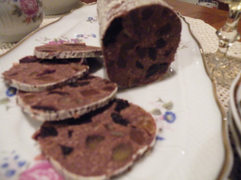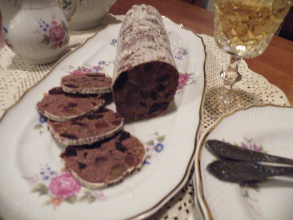 a felolvasztott csokoládét. Alaposan összekeverem, műanyag fóliára öntöm, szalámi formára alakítom.
