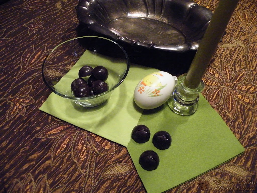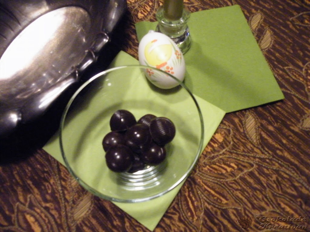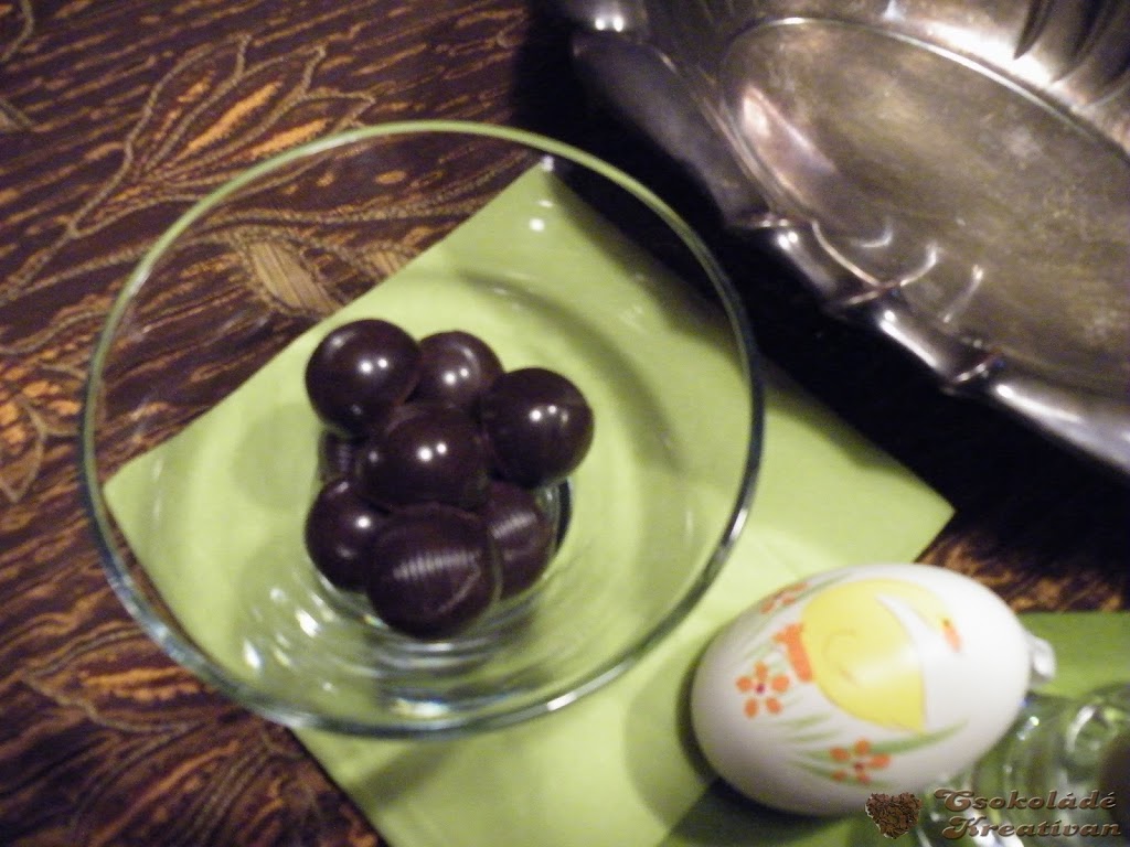 Az apró darabokra tört csokit a csoki olvasztó gépben 40-45 fok-ig melegítem. Kiemelem a csoki tégelyt a gépből, a hűvös konyha pultra teszem és állandó keverés mellett lehűtöm 34- 35 fok-ra. Ekkor teszem bele a mikróban felolvasztott kakaó vajat és ezzel is jól elkeverem és munkahőmérsékletre ( 31-32 fok) hűtöm. A tisztára törölt lemez minden mélyedésébe öntök a csokiból, néhányszor a pulthoz ütöm, ( így távozik a levegő a csokiból és szép sima felületű lesz így a bonbon ) majd megfordítom a lemezt és a csokit egy sütőpapírral bélelt tálra csepegtetem, a felesleget spaklival húzom le. Két fakanalat teszek a tálra és ráfektetem a lemezt, így a csoki mindenhol egyenletesen terül el, ezáltal egyforma vékony csoki burkot kapunk. A lemezt megfordítom, spaklival ismét simára húzom, fél órára hűtőbe teszem. az idő letelte után kiskanál segítségével töltöm úgy, hogy először a meggyet teszem bele ( 2-3 szem ), majd a krémet kanalazom hozzá, vigyázva, hogy maradjon hely a lefedéshez ( kb. 2 mm ). A csokit újra temperálom, ráöntöm a lemezre vigyázva, hogy minden bonbon hüvelybe jusson belőle, spaklival simára húzom, egy órára hűtőbe teszem. Az idő letelte után megfordítottam a lemezt és a bonbonok kipottyantak belőle.