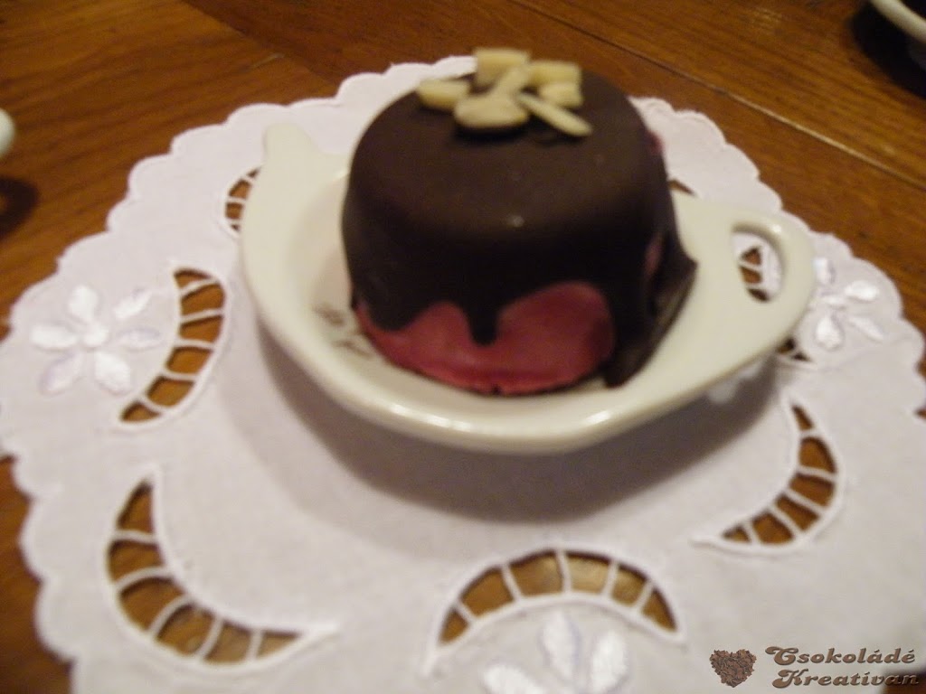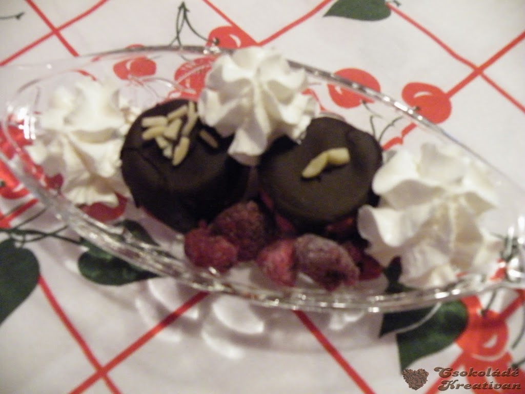 A csokit temperáltam. Az apró darabokra tört csokit 40-45 fok-ra melegítettem a csoki olvasztó gépben, majd 34- 35 fok-ra hűtöttem és beletettem a mikróban felolvasztott kakaóvaj pasztillát, és állandó keverés mellett, 31-32 fok-ra hűtöttem a csokit. Az időközben megszilárdult jégkrémet kifordítottam a maffin formából egy tálra és a csokit egy gyors mozdulattal rákanalaztam. Egy zárható, műanyag dobozba tettem és mélyhűtőben tároltam fogyasztásig.