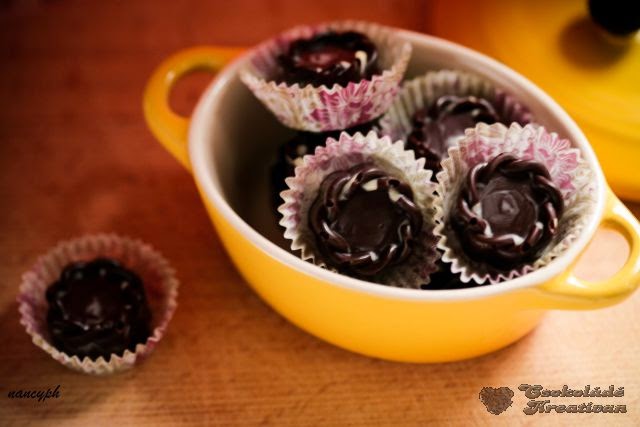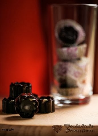 tartályt és hideg lapra ( pl. konyhapult ) helyezem és állandó keverés mellett 34-35 fok-ra hűtöm. Ekkor beleteszem a kakaóvaj port, alaposan elkeverem. Ha a csoki elérte a 31-32 fok hőmérsékletet akkor kiveszem a hűtőből a bonbon formát és beleöntöm a temperált étcsokoládét. Az asztalhoz ütögetem a bonbon formát,( így a keletkezett légbuborékok eltávoznak ) és a csokit egy tálra helyezett sütőpapírra csepegtetem. A sütőpapírt azért szeretem használni, mert a dermedt csokit később maradéktalanul fel tudom használni, ha egy tálra öntöm akkor sok megy veszendőbe.) A bonbon formát kb. fél órára hűtőbe teszem, majd egy kiskanál segítségével megtöltöm krémmel, vigyázok, hogy maradjon hely ( kb. 2 mm ) a lezárásnak. A csokoládét ismét temperálom, lezárom a formát, a felesleget spaklival lehúzom és egy órára hűtőbe teszem. Az egy óra elteltével kiveszem a hűtőből, megfordítom a formát és kipottyantak belőle a bonbonok.